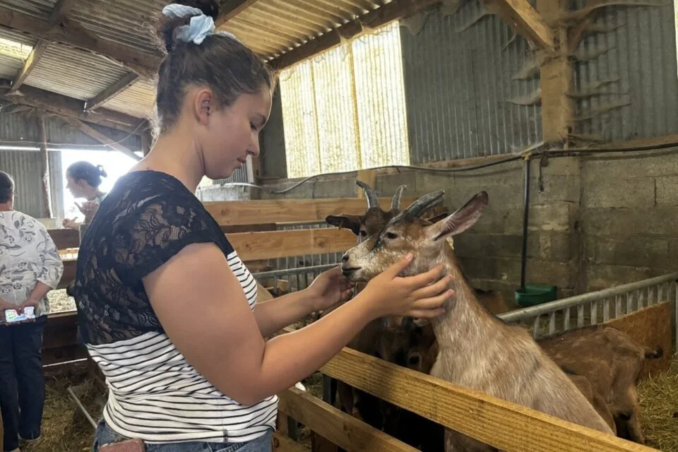Séance câlins avec les chevrettes lors de la visite de la chèvrerie ©Luane Royer